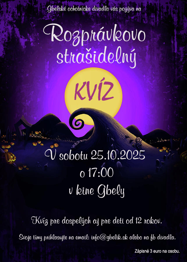 Gbelské ochotnícke divadlo Gbelík vás pozýva na rozprávkovo-strašidelný kvíz pre dospelých aj pre deti od 12 rokov, ktorý sa bude konať v sobotu 25. októbra o 17:00 v hlavnej sále gbelského kina! Svoje tímy (názov tímu plus približný počet členov) môžete prihlasovať na náš email: info@gbelik.sk alebo nám napíšte do správy na našom fb profile.